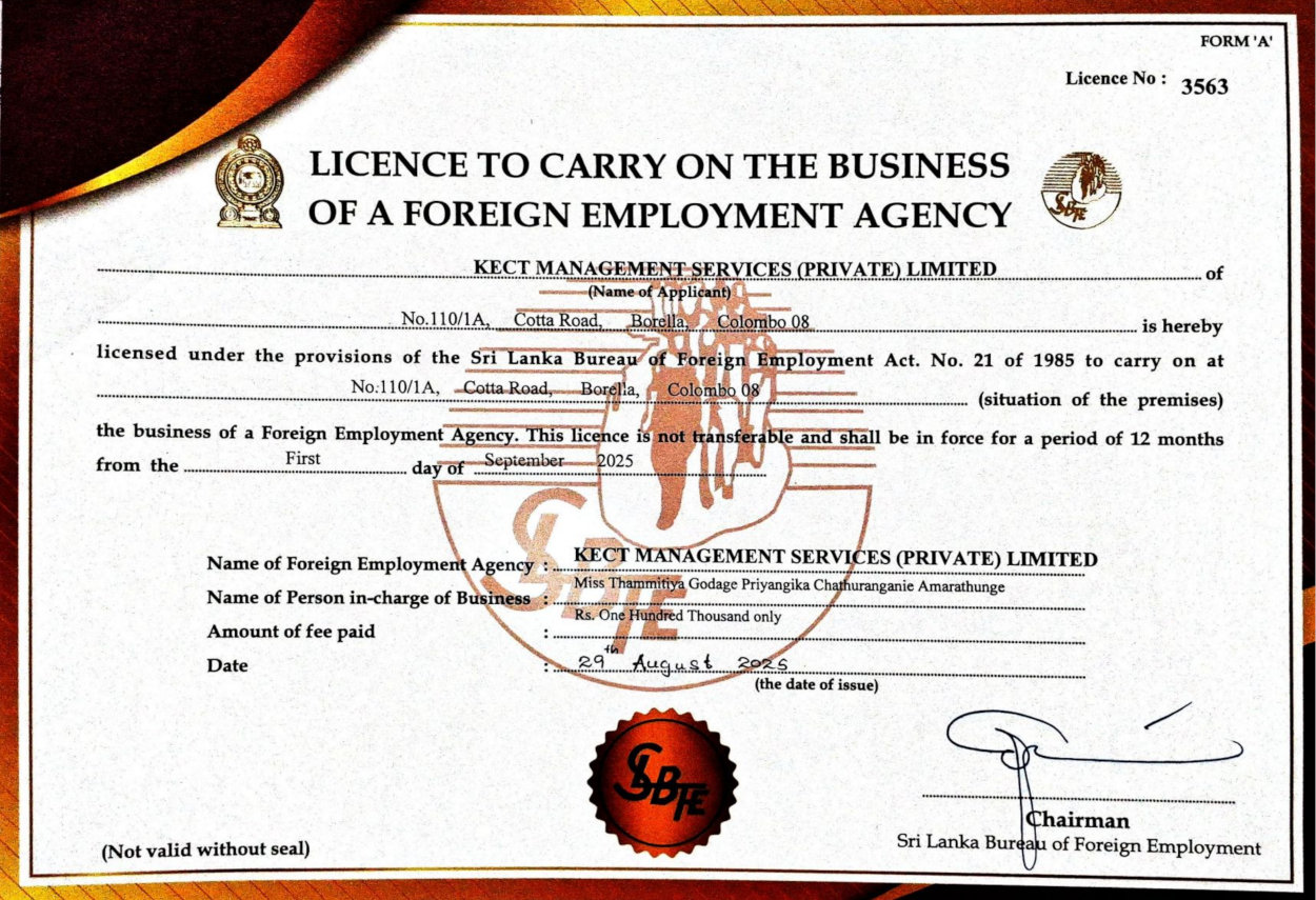 KECT Management Services Services (Private) Limited. has emerged as a reputable and internationally recognized recruitment organization based in Sri Lanka. The company is duly incorporated as a private limited entity and is officially licensed by the Sri Lanka Bureau of Foreign Employment (SLBFE) under License No. 3563, authorizing us to operate in full compliance with national and international labor standards.